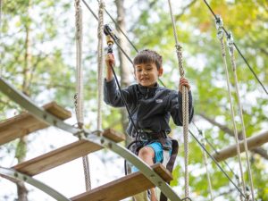 Young boy crossing a rope bridge at Adirondack Extreme Adventure Course in Bolton Landing, NY