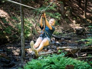 Teen girl smiling while ziplining through the forest at Adirondack Extreme Adventure Course