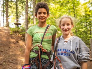 Two students proudly pose after conquering the aerial adventure course. Adirondack Extreme provides group packages for school field trips, encouraging collaboration, leadership, and outdoor fun for students ages 6 and up