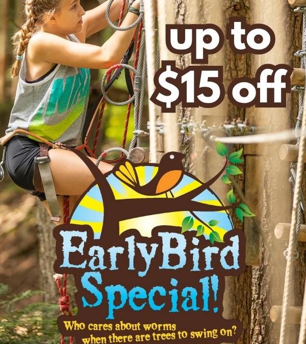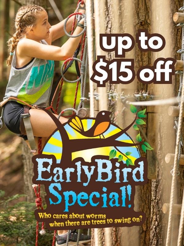 A girl with braided hair is shown mid-climb on an aerial ropes course at Adirondack Extreme Adventure Park, surrounded by trees and safety ropes. The promotional text reads “Up to $15 off – Early Bird Special! Who cares about worms when there are trees to swing on?” A colorful logo featuring a bird on a branch enhances the playful tone of the offer. This image promotes Adirondack Extreme’s limited-time Early Bird Discount, available on select adventure course departures from May through September.