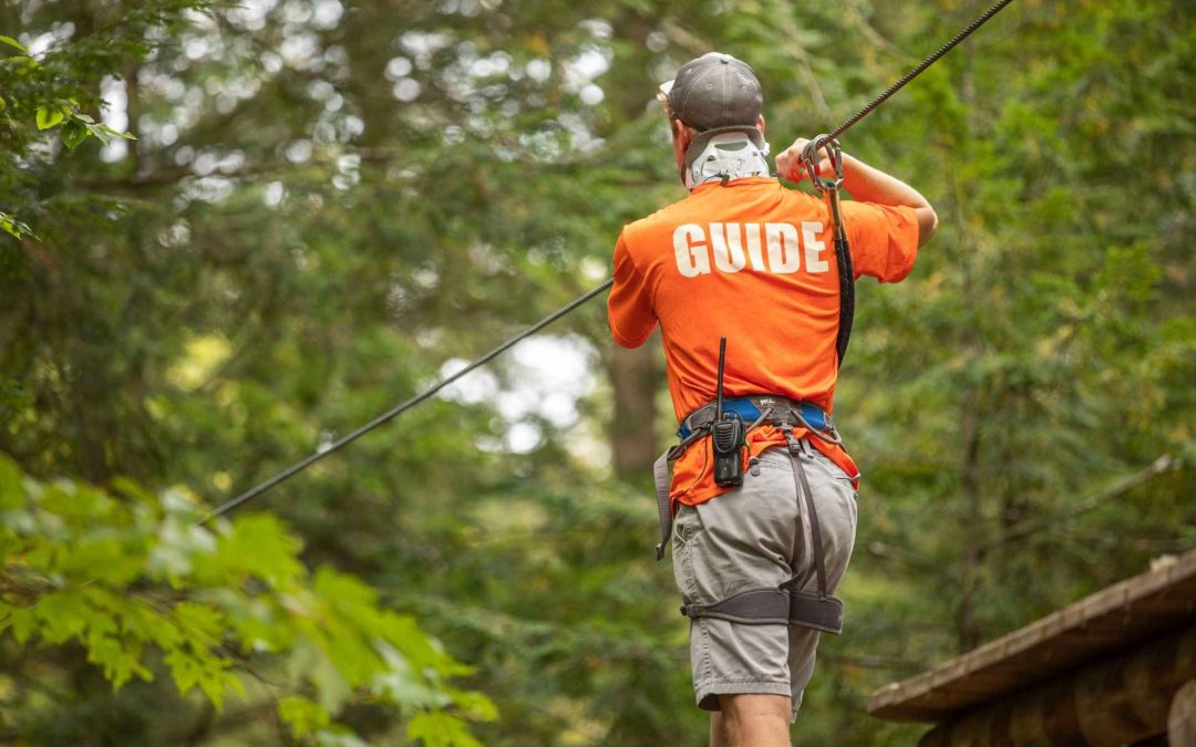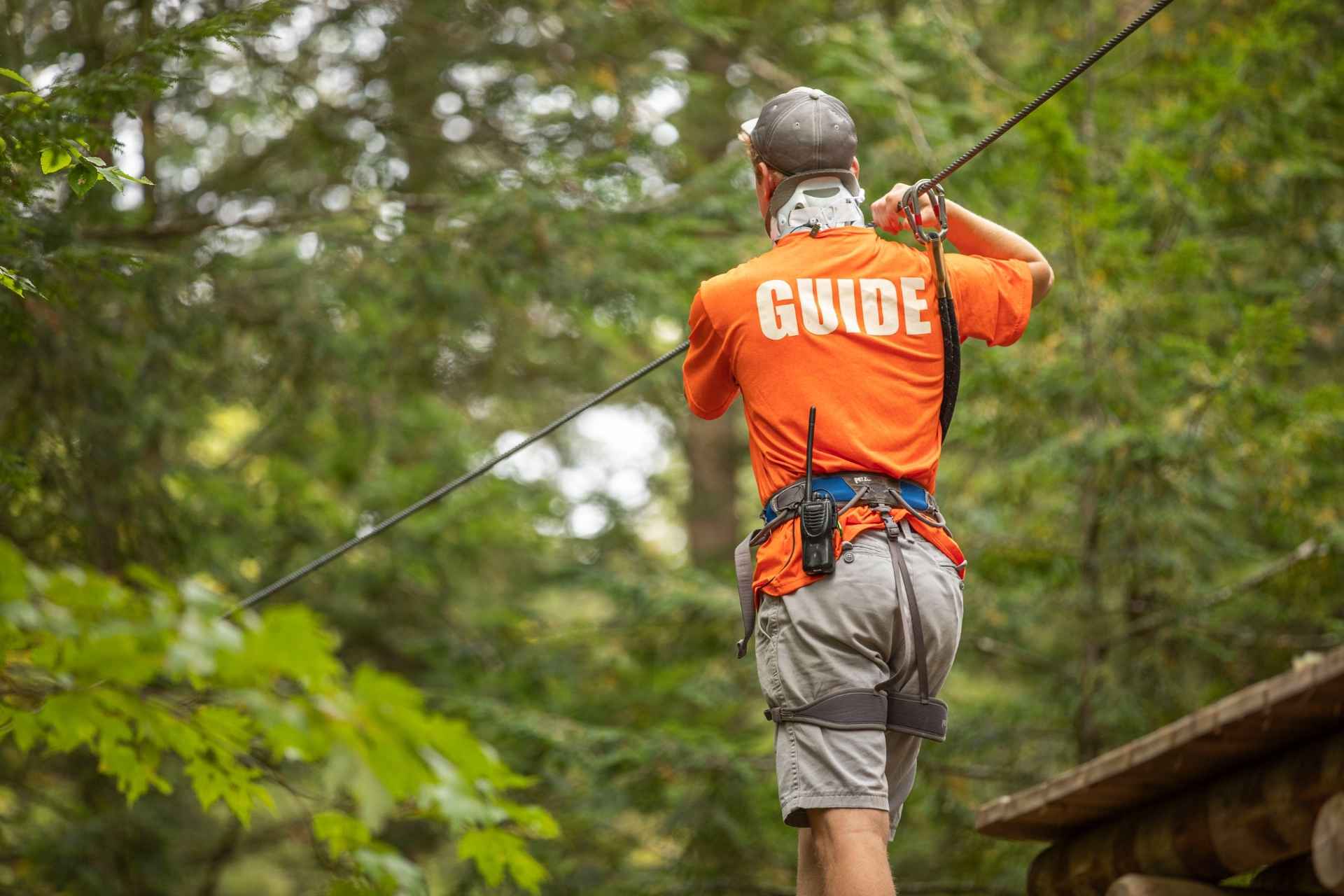 adventure course guide employee on rope obstacle